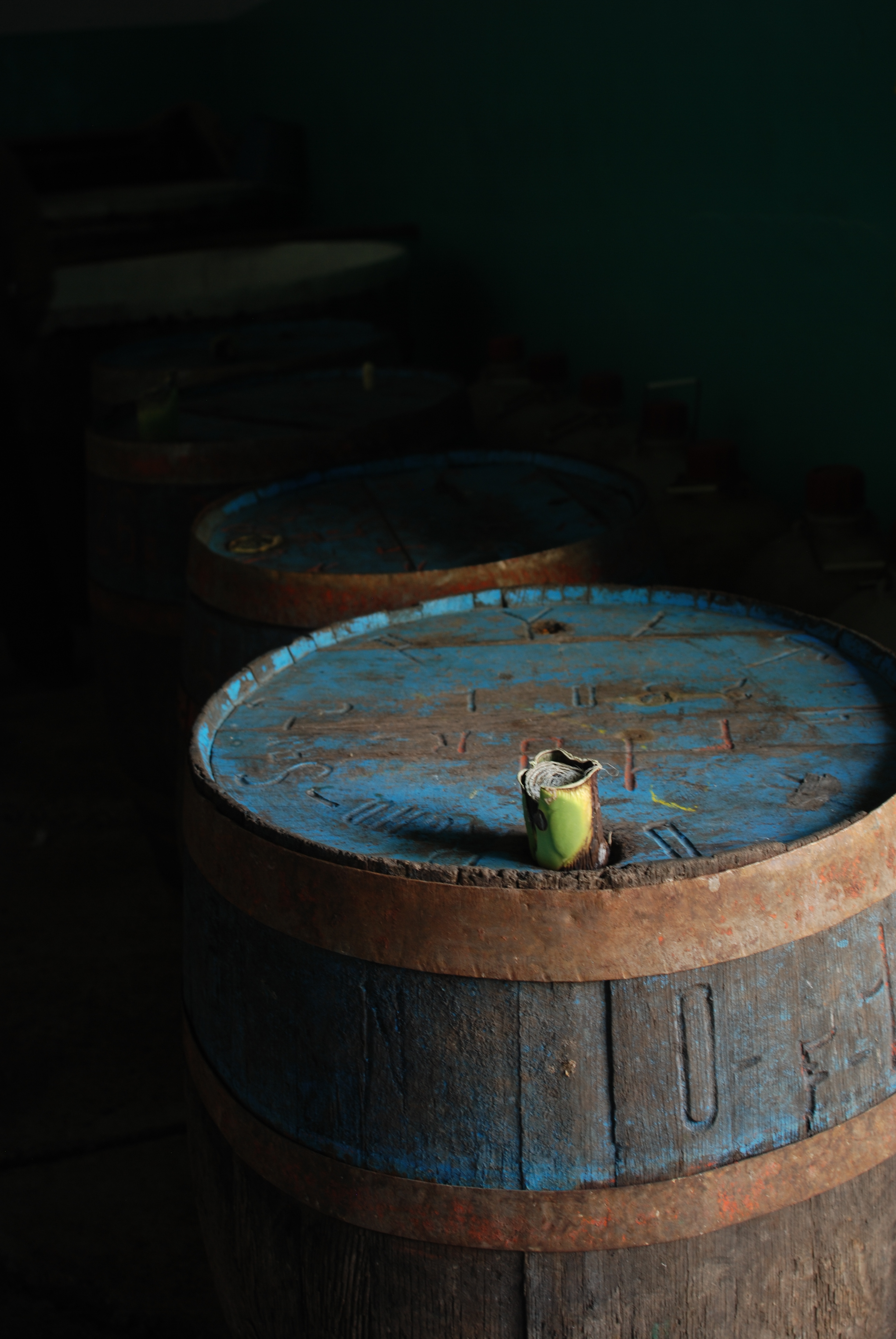 Pulque is briefly stored in barrels before being delivered to various eateries & pulque bars. Corked with some sort of cane to help it breathe and not blow up in the barrels.