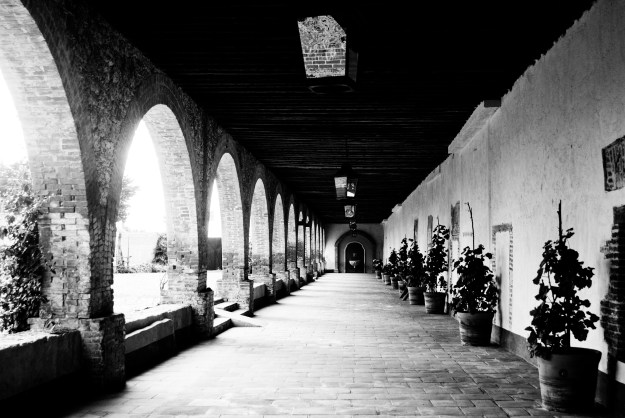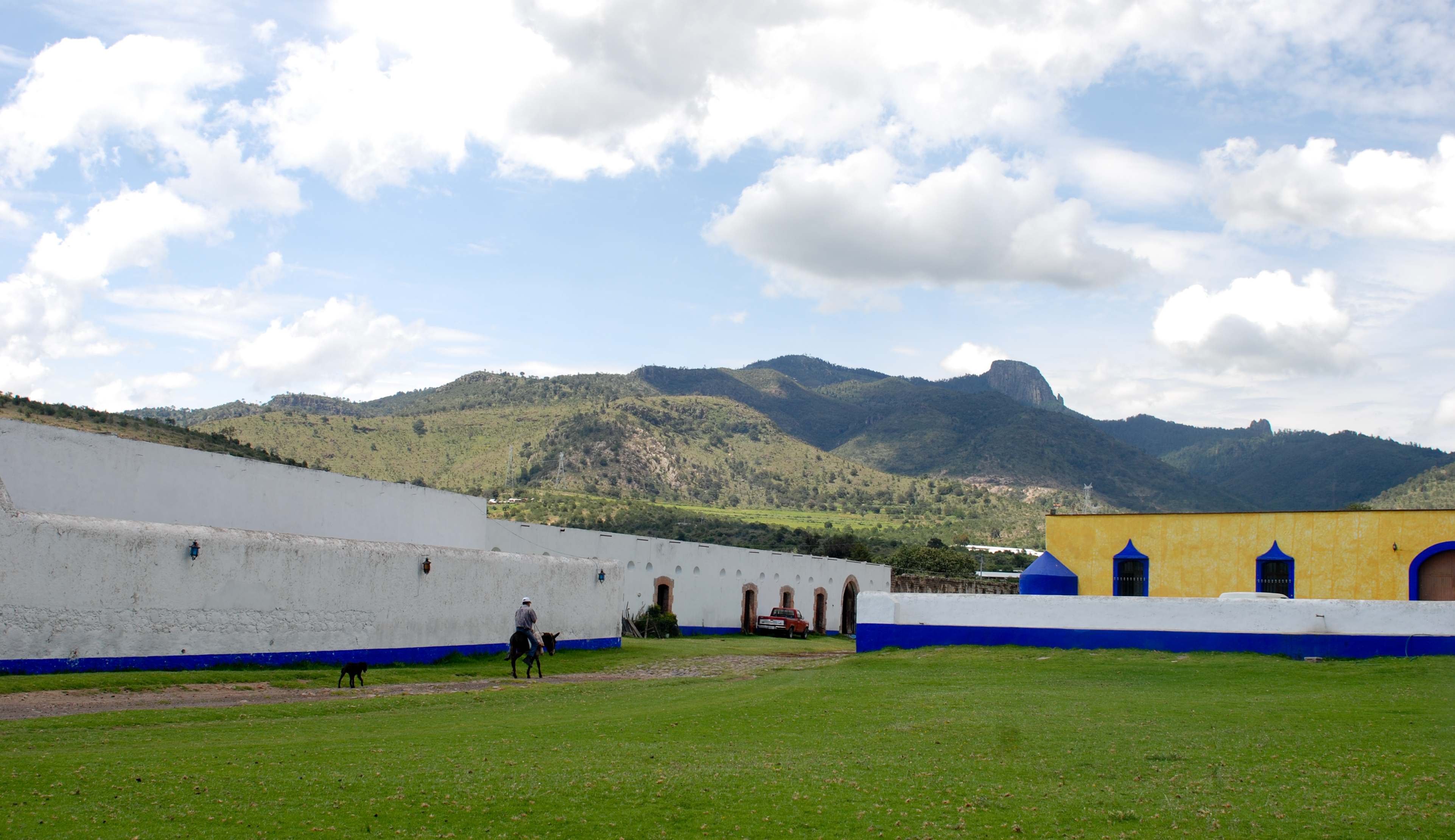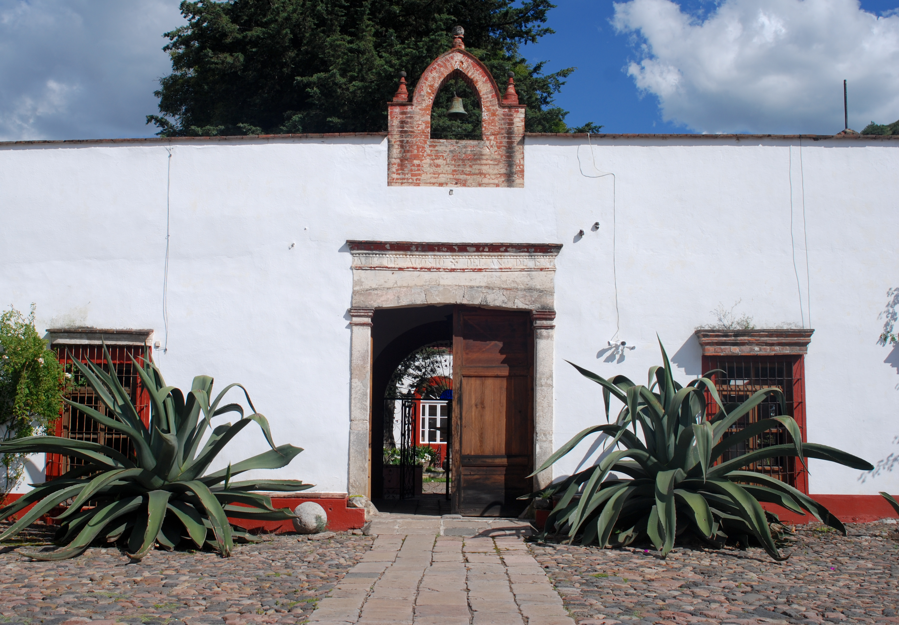 First entrance into the walled Hacienda. Cobblestones, brickwork, artisan woodworking & maguey plants.