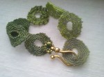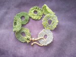 I wanted to do something with a bit of weight, but still delicate… just like all the plant starts in my garden. Bright, delicate, and strong. So I started playing around with some bead stitch work and came up with the basic shape I wanted. Originally I pictured doing a necklace of various green circles graduating from one color to another. But time constraints won out this week and I have to console myself with just a bracelet… and plans to make the necklace at some time after our Family Anniversary is over.